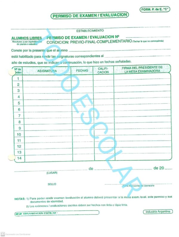 Permiso De Examen Alumno Libre, Duplicado X 100 – P DE E C
