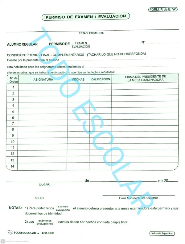Permiso De Examen Alumno Regular x 100 – P de E A